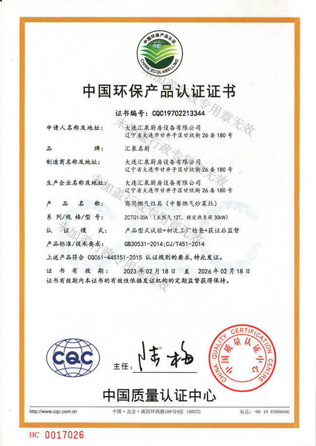 中餐燃气炒菜灶环保认证证书